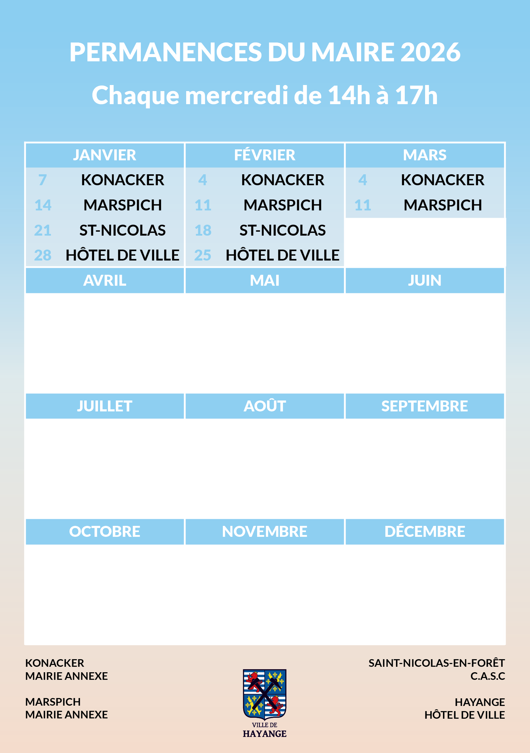 Véritable outil démocratique, les permanences sans rendez-vous permettent à chacun des Hayangeois d’échanger avec Monsieur le Maire les mercredis, en alternance à l’Hôtel de Ville, dans les mairies annexes de Marspich et du Konacker, et au CASC à Saint-Nicolas-en-Forêt.